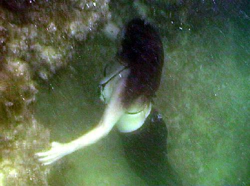 Here, Teresa freedives 30 feet to the stern of a sunken cabin cruiser...