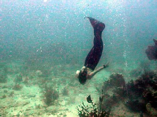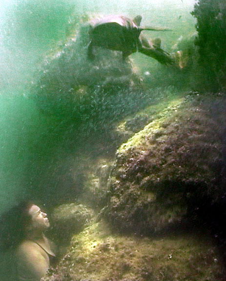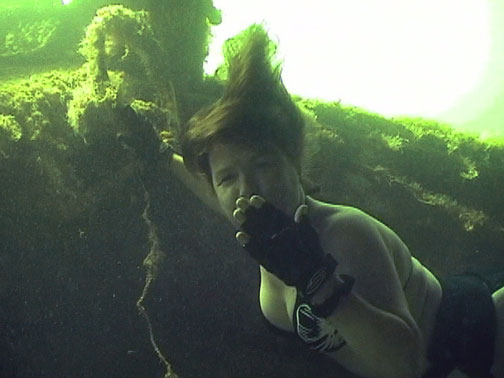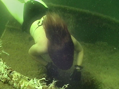 Here, Teresa freedives 30 feet to the stern of a sunken cabin cruiser...
